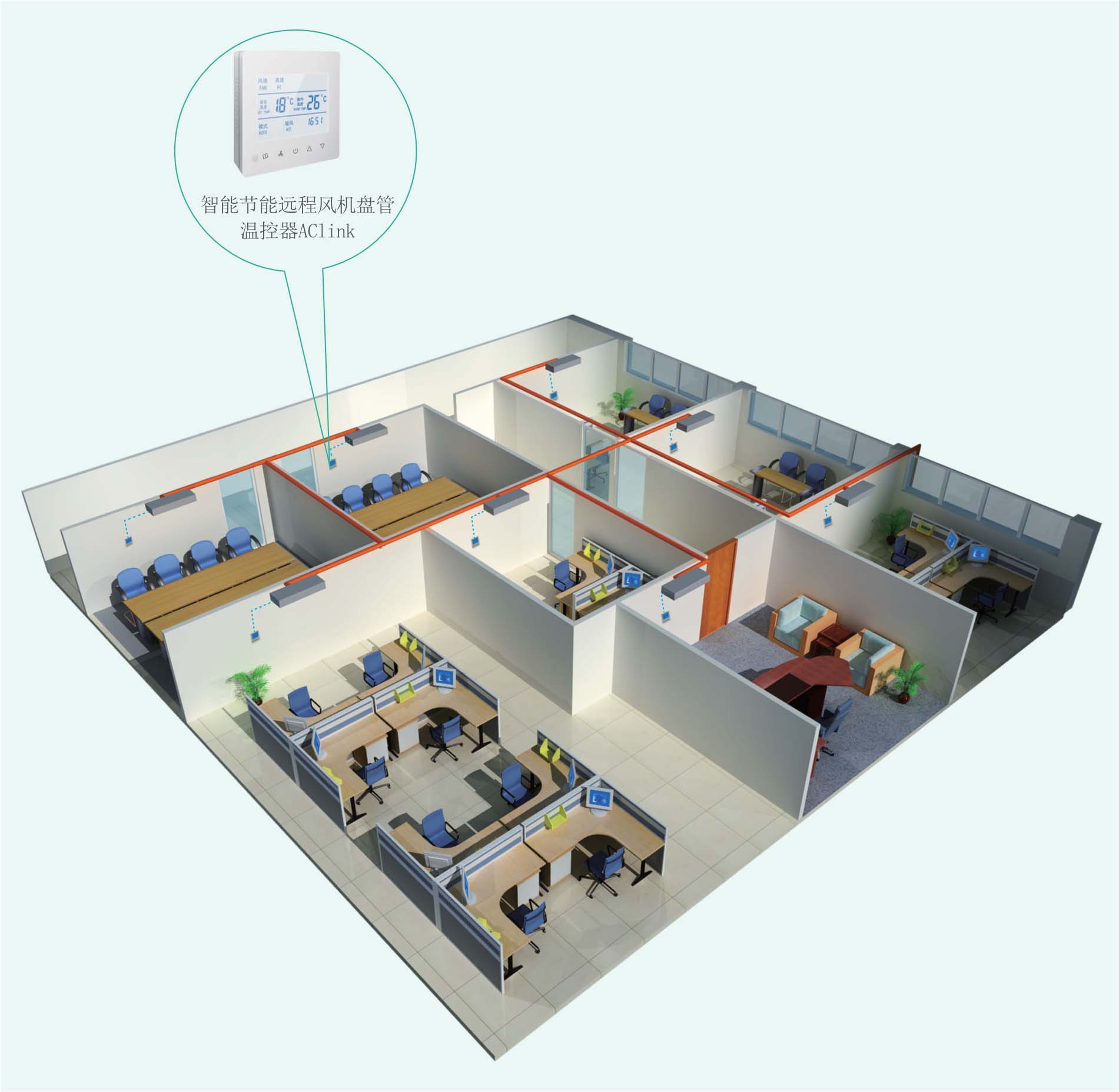 AClink應用于水系統(tǒng)的中央空調末端風機盤管的智能節(jié)能遠程控制,應用場所主要有醫(yī)院、酒店、寫字樓、辦公室等,AClink有各類豐富的配置,不同的應用場所可以配置不同的功能,在保證正常使用空調的前提下最大限度智能化節(jié)能。